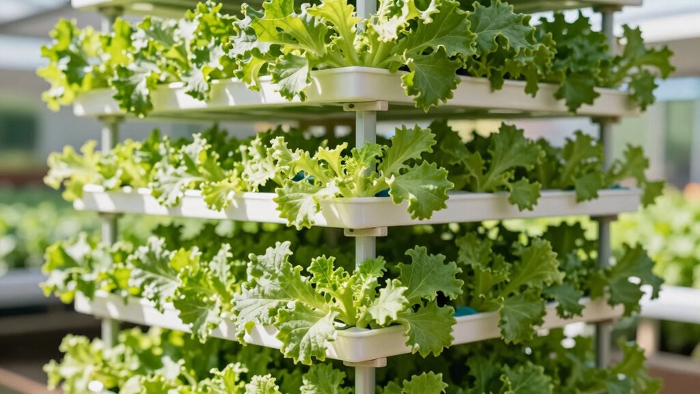 Plant growth rates can vary considerably in hydroponic towers, influencing how close together you should space your plants. Faster-growing plants need more room to avoid root competition, which can stunt their development. Conversely, slow growers might tolerate tighter spacing without issues. The diversity of plants you choose also impacts growth variability; different species have unique growth speeds and root structures. If you mix fast and slow growers, you’ll need to adjust spacing to accommodate the quicker root expansion of certain plants. Additionally, using best waterwick pots can help maintain consistent moisture levels, promoting healthier growth. Understanding healing trust after infidelity can foster a healthier mindset while gardening. In hydroponics, nutrient solutions play a crucial role in optimizing growth rates. Monitoring growth patterns is key—if roots start overlapping or crowding, it’s a sign to increase spacing. Furthermore, implementing brewing fundamentals can enhance your understanding of the environmental factors that contribute to plant success. Understanding these factors helps optimize plant health, maximize yield, and prevent problems caused by uneven growth or root competition. Additionally, incorporating clear, step‑by‑step guidance can further enhance your hydroponic gardening success.