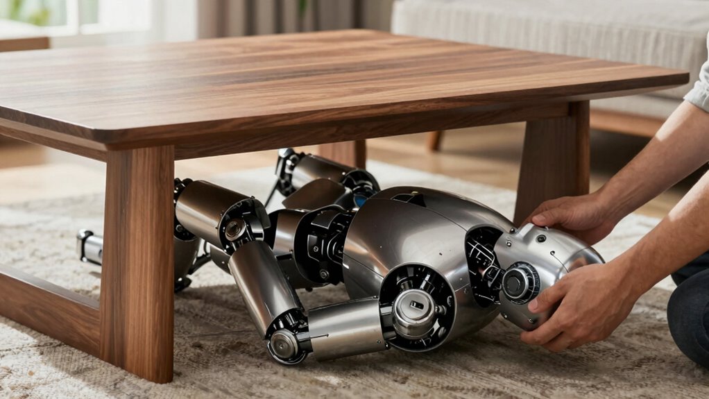 If your vacuum gets stuck under furniture, quick action can get it moving again without much hassle. First, check for debris or tangled brushes that may be be hindering movement. Clearing out obstacles allows your robot to resume cleaning smoothly. Regular robot maintenance, like cleaning sensors and wheels, helps prevent future issues. Adjust your cleaning schedules to avoid busy times when furniture might be shifted or cluttered. Here are quick fixes to try immediately: