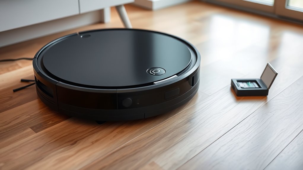 When it comes to battery life, more isn’t always better; don’t put all your eggs in one basket. A higher battery capacity can extend cleaning time, but it might also add weight or reduce maneuverability, affecting cleaning efficiency. Consider your space and needs. Sometimes, a balanced battery life guarantees your robot vacuum cleans effectively without unnecessary bulk, proving that quality beats quantity every time.