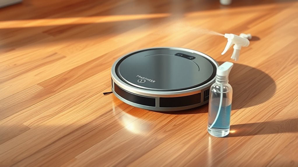 To keep your robot vacuum smelling fresh, regularly check and replace or clean the filters, and empty the dustbin often. Use natural odor absorbers like baking soda or activated charcoal inside or near the vacuum. Wipe interior parts and inspect brushes for debris to prevent odors. Store it in a cool, dry place and consider adding scented sachets or sprays. For more tips on maintaining a fresh-smelling vacuum, keep exploring the best methods for odor control.