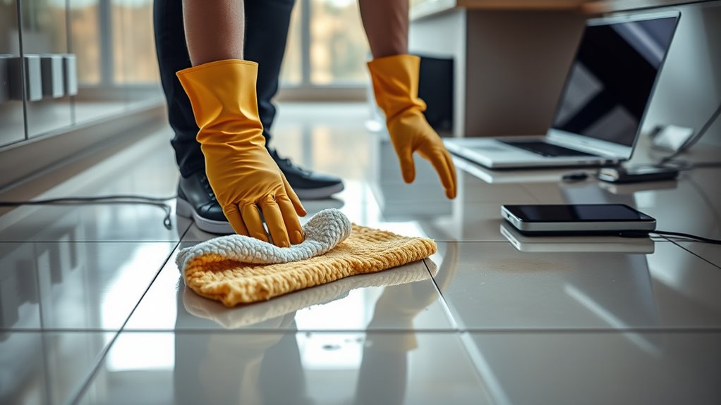When mopping around electronics, always turn off and unplug devices to prevent water from causing a short circuit or damage. Use a damp, not soaking, mop and be cautious near outlets and cords, avoiding splashing water into electrical fixtures. Consider moving devices out of the way or covering them with plastic. After cleaning, thoroughly dry floors and devices before plugging back in to reduce moisture risks. Staying aware of these tips helps keep both your electronics and safety intact—you’ll find more helpful guidance below.