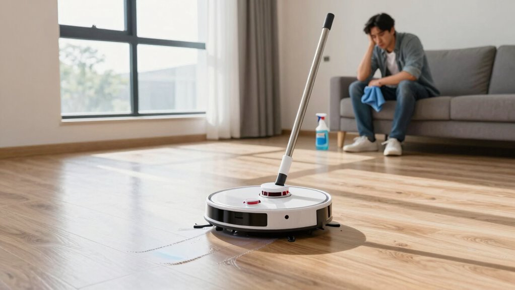 To safeguard your laminate floors while using a robot mop, avoid three key mistakes: using excessive moisture or harsh cleaning solutions that can cause damage, neglecting to clean or replace pads regularly, and setting the wrong cleaning mode that’s too vigorous for delicate surfaces. Be cautious with moisture levels and maintenance to keep your floors looking their best. Keep these tips in mind, and you’ll discover more ways to ensure efficient, safe mopping.
