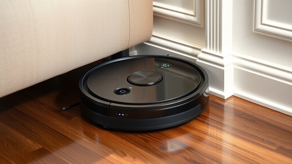 Incorporating these maneuvers into your routine guarantees a more extensive clean, particularly in those tricky corners and along baseboards. With the right settings and proper maintenance, your robot vacuum will master edge cleaning and wall adaptation, turning what used to be tedious chores into effortless tasks. The combination of smart navigation and adaptive features ensures your floors stay spotless, even in the most challenging corners.