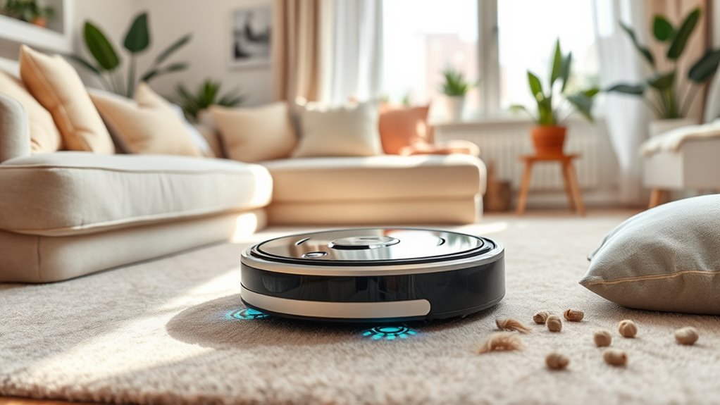 During allergy season, choose a robot vacuum with a HEPA filter to trap tiny allergens like pollen and dust mites effectively. Set your vacuum to its highest suction mode and schedule regular cleanings, at least daily or multiple times a week, to reduce allergen buildup. Keep your space clutter-free and maintain the filters often for peak performance. Want more tips on maximizing your vacuum’s allergy-fighting power? Keep exploring for useful strategies.