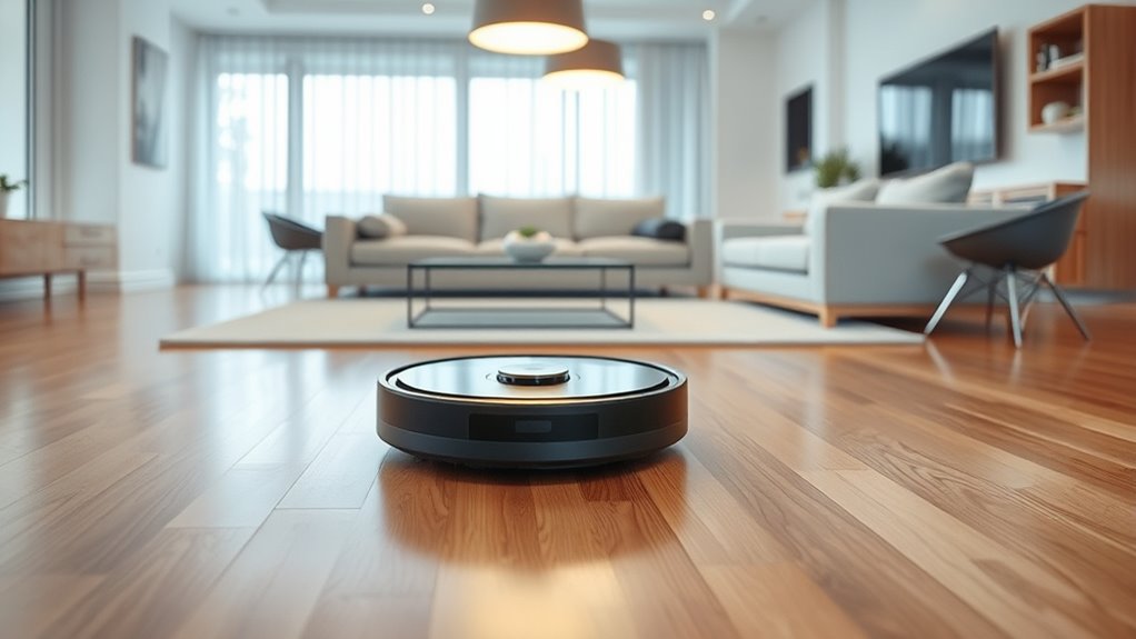 Lastly, keep software updates current. Manufacturers often release firmware improvements that enhance sensor calibration algorithms and obstacle detection capabilities. Regular updates ensure your robot vacuum benefits from the latest navigation enhancements, especially crucial in open floor plans where navigation is more complex. Consistently maintaining sensor cleanliness, recalibrating when needed, and customizing navigation settings will considerably improve your vacuum’s performance. In doing so, you’ll help it adapt to the open environment, ensuring a thorough clean without frequent bumps or missed spots. With these steps, your robot vacuum becomes more efficient at tackling open floor plans, making your cleaning routine smoother and more effective.