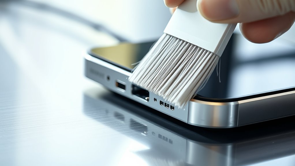Imagine your dock as a delicate garden needing gentle care. You should use mild, non-abrasive cleaning agents like isopropyl alcohol or a soft cloth dampened with water. Safety precautions are essential—avoid harsh chemicals and excessive moisture that could harm sensitive components. With careful handling, you protect your dock’s sensors and charging pins, ensuring they stay clean and functional without damage, much like nurturing a thriving garden.