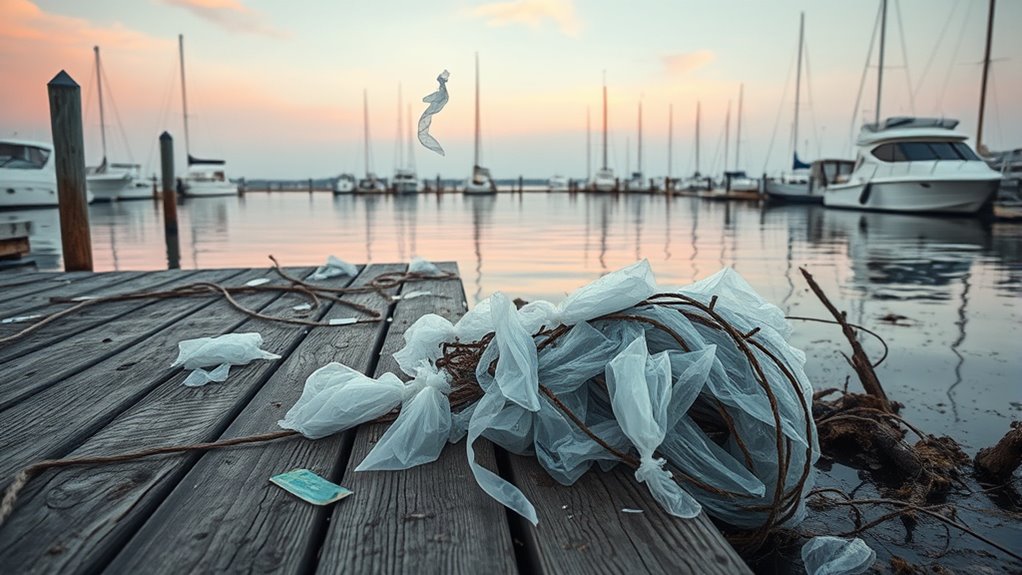 Disposable dock bags harm the environment because they’re made from plastics that take decades or centuries to decompose, polluting waterways and harming wildlife. When discarded improperly, they can be ingested or entangle animals, adding to global plastic waste. Manufacturing these bags uses fossil fuels, releasing pollutants and depleting resources. Recycling is difficult, and most end up in landfills or incinerators, worsening their environmental footprint. To understand how these issues connect, keep exploring the full impact.