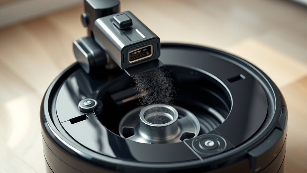 The key to a smooth self-emptying process lies in the design of the station and the vacuum’s ability to communicate effectively. When the dustbin in the vacuum fills up, sensors trigger the transfer process. The vacuum automatically docks at the station, where a motorized mechanism empties the dustbin into a larger bag or container. This process is quick, clean, and seamless, so you don’t have to handle dirt or messes manually. Proper maintenance of your robot vacuum involves ensuring the self-emptying station functions correctly. Regularly check for blockages or full bags in the station to prevent overflow or malfunctions. Also, keep the station and the vacuum’s sensors clean, so the transfer process remains smooth. With a good understanding of dustbin capacity and routine upkeep, you can extend the lifespan of your device and maintain ideal performance over time. Overall, self-emptying dustbins offer a hassle-free way to keep your floors clean while reducing the time and effort spent on robot vacuum maintenance. It’s a smart upgrade that lets you enjoy a cleaner home with minimal intervention. Additionally, understanding the dustbin capacity helps optimize your vacuum’s efficiency and reduce the frequency of emptying.