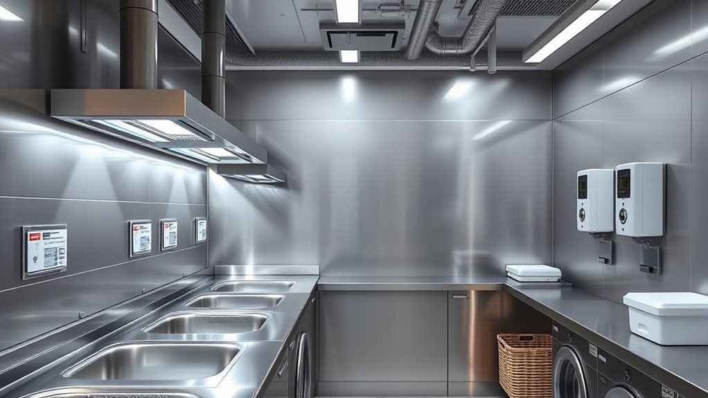If you’ve noticed unpleasant odors in wash-dry stations, you’re not alone. Many facilities face this issue, often because of inadequate ventilation or lingering moisture. The good news is that you can take simple, effective steps to prevent these odors from becoming a persistent problem. First, focusing on ventilation solutions is essential. Proper airflow helps remove damp air, mold spores, and other odor-causing particles. Installing exhaust fans or upgrading existing ventilation systems ensures continuous air exchange, reducing humidity levels that foster bacteria and mold growth. Keep vents clean and unobstructed so they work efficiently. Additionally, consider adding air purifiers with HEPA filters to capture airborne contaminants that contribute to odors. These measures promote a fresher environment and considerably cut down on the smell that can develop in enclosed spaces. Incorporating AI-driven monitoring solutions can optimize ventilation and humidity control systems for even better odor prevention.