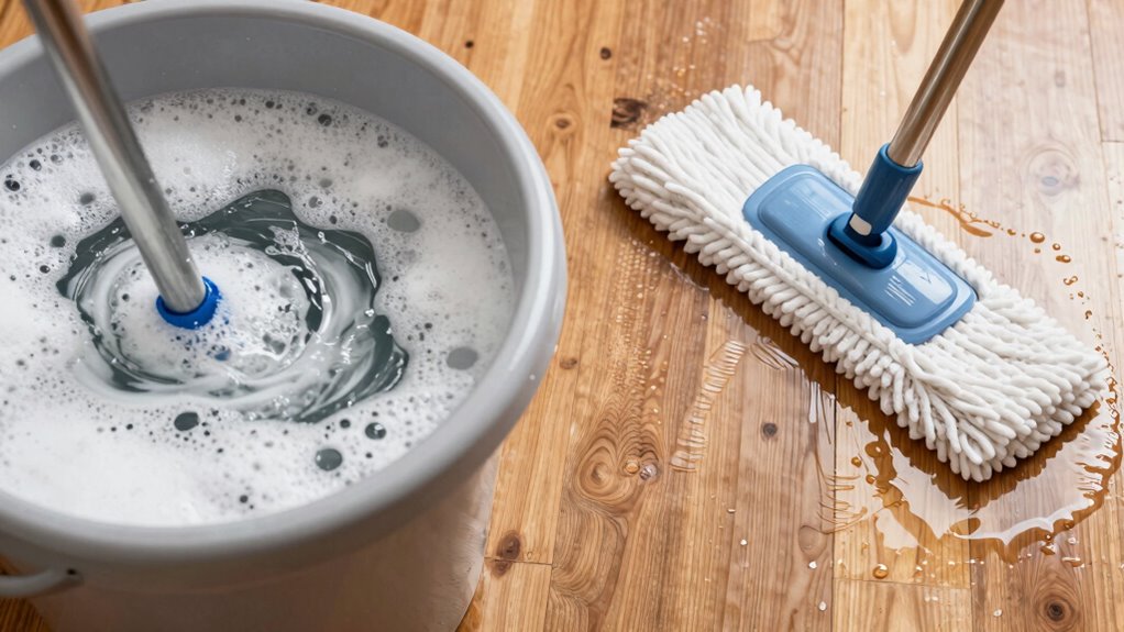 Reusing your mop without proper cleaning can quickly spread dirt and bacteria, undoing all your hard work. If you store your mop improperly, bacteria can thrive, making each reuse a health risk. Always rinse and disinfect your mop thoroughly after each use. When selecting chemicals, choose disinfectants suited for mops to ensure germs are eliminated. Avoid using harsh chemicals that can damage your mop or leave residues. Proper mop storage involves hanging it in a dry, ventilated area to prevent mold. Use the table below to guide your cleaning routine: