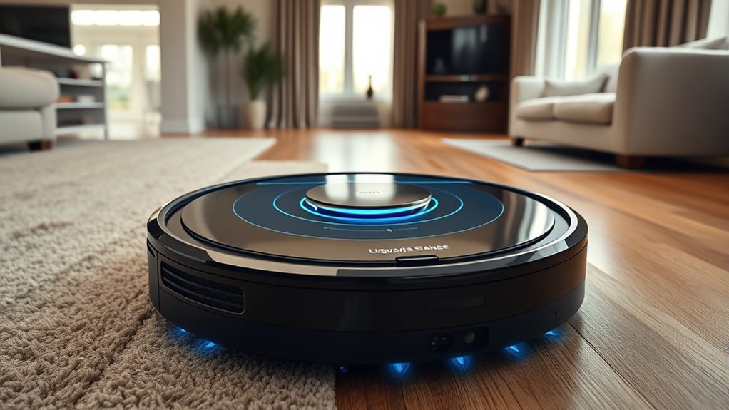 Furthermore, smart mapping enables features like targeted cleaning zones and scheduled cleanings. Once the map is built, you can specify particular rooms or areas for *focused* cleaning, which is especially useful if you want to prioritize high-traffic zones. Scheduled cleaning allows your vacuum to run automatically at set times, knowing exactly where to go thanks to its detailed map. These capabilities give you more control and convenience, reducing the need for manual intervention. Additionally, mapping accuracy depends significantly on the quality of sensors and algorithms, which continue to improve with technological advancements.