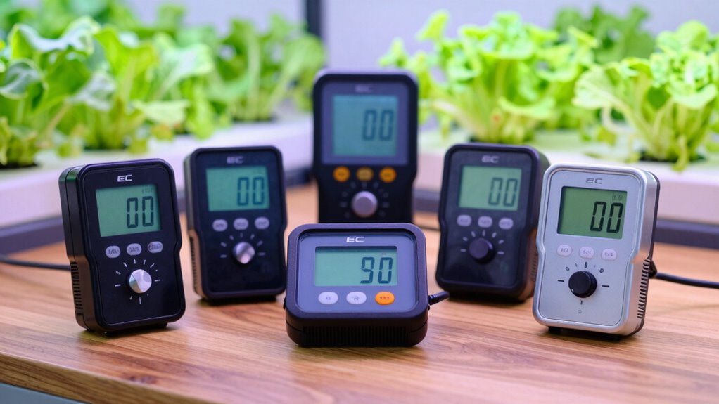 Understanding the measurement range of an EC meter is crucial for effectively managing nutrient levels in hydroponics. A typical range of 0 to 9990 µS/cm allows me to accurately assess the nutrient concentration in my solutions. This flexibility is essential, as seedlings need lower levels while mature plants require higher concentrations. If I choose a meter that can measure both ends of the spectrum, I can prevent nutrient deficiencies or toxicities that might stunt growth or reduce yields. Additionally, opting for a meter with automatic temperature compensation (ATC) guarantees my readings remain accurate, regardless of temperature fluctuations. Picking the right measurement range helps me maintain ideal growing conditions, tailoring nutrient solutions to meet my plants’ needs effectively.