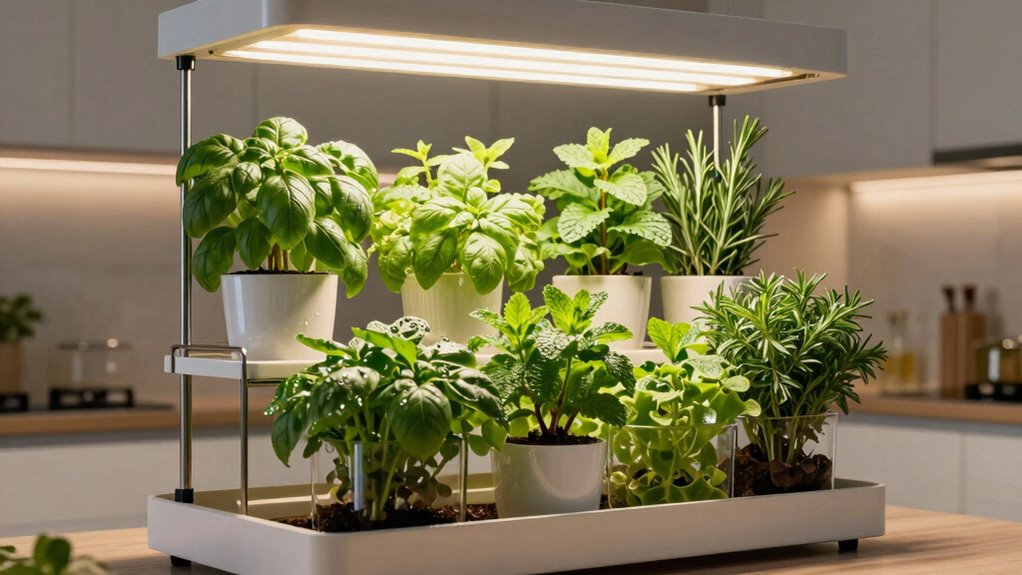 I’ve found the 15 best indoor garden systems for herbs in 2026, featuring modern designs, smart lighting, and automated watering that make growing herbs easy and stress-free. These systems are compact, space-efficient, and perfect for small apartments. They support multiple plants, boost growth speeds, and offer customizable features for peak results. If you want to discover the top options and learn how they can transform your herb gardening experience, keep exploring further.