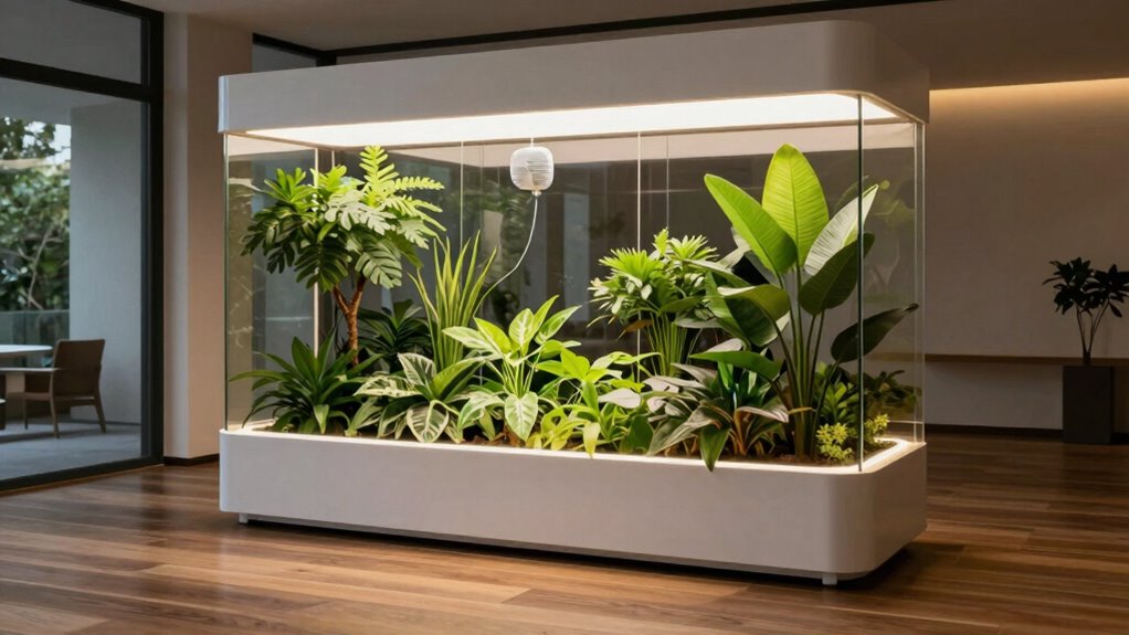 A well-designed indoor garden system prioritizes noise reduction by incorporating components specifically engineered for quiet operation. This includes using silent water pumps and low-noise circulation fans that run below 20dB, keeping sound levels unobtrusive. Sound-dampening enclosures around mechanical parts further minimize noise, ensuring a peaceful environment. Efficient design also involves automatic water circulation and airflow mechanisms that operate quietly without harming plant health. Additionally, adjustable or removable components—like light poles and water pumps—allow customization to optimize noise levels based on space and user preferences. By thoughtfully selecting these components and integrating sound-reducing features, you can create an indoor garden that’s both functional and quietly unobtrusive, perfect for maintaining a serene indoor space.