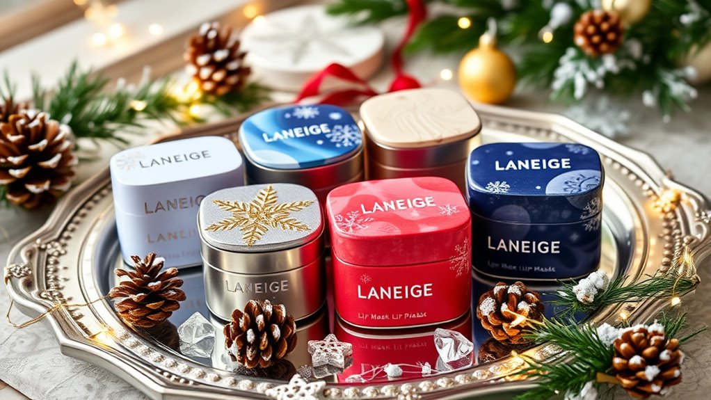 How the packaging looks and feels can considerably influence your decision when selecting a Laneige Lip Mask Holiday Set. I pay attention to the overall design—festive, seasonal touches that make it feel special for gifting. The size of the set matters too; I check if it includes full-sized products or travel-sized versions, depending on my needs or the recipient. Compact packaging is a plus, making it easy to store or carry while traveling. I also look for packaging that’s durable and secure, so it won’t get damaged during shipping or handling. A visually appealing design that aligns with holiday aesthetics adds to its charm, making it an attractive gift option. Ultimately, well-thought-out packaging enhances the entire experience, whether for myself or as a present.