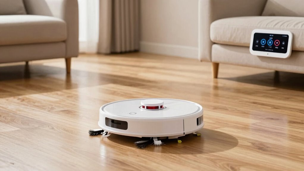 Smart control features are essential in choosing a budget-friendly robot mop because they enhance convenience and customization. I look for models with app control, so I can schedule cleaning, select modes, and monitor progress in real time from my phone. Voice command support through Alexa or Google Assistant is a big plus, allowing hands-free operation. Customization options within the app, such as setting no-go zones, adjusting water flow, and choosing specific cleaning modes, help tailor cleaning to my needs. Remote control features are also handy when I want to manually direct the robot. Ultimately, I guarantee the app is user-friendly and compatible across my devices for seamless operation. These features make managing my robot mop simple and efficient without breaking the bank.
