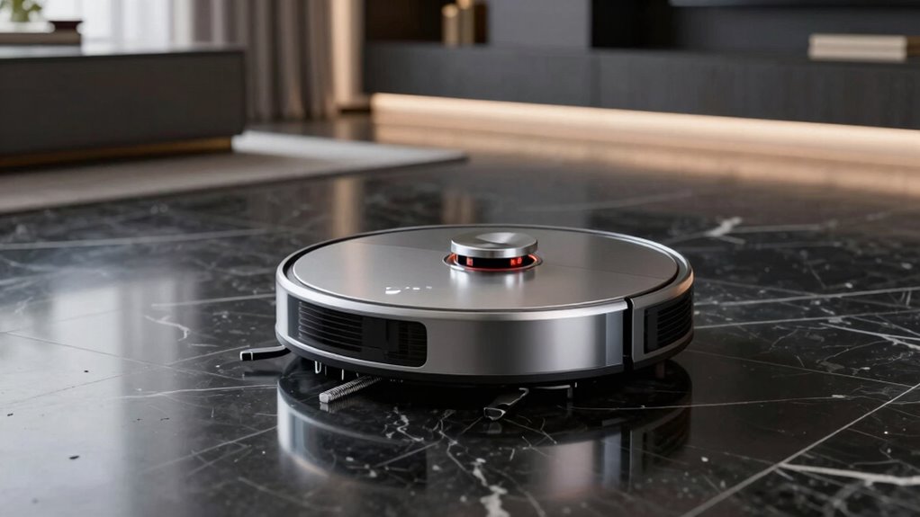 Suction power is a critical factor for cleaning high gloss floors effectively, as it determines how well a robot vacuum can pick up dust, debris, and pet hair without scattering or leaving streaks. For these reflective surfaces, a minimum of 2000Pa is essential to guarantee thorough cleaning without debris bouncing back. Higher suction levels, around 4000Pa to 6000Pa, are recommended for deeper cleaning and to prevent scattering on shiny surfaces. I also look for models with adjustable suction, so I can switch to gentler power on delicate finishes or ramp up for stubborn dirt. Keep in mind, excessively high suction might scratch sensitive surfaces, so having control over the suction level is crucial for maintaining the glossy finish while keeping floors spotless.