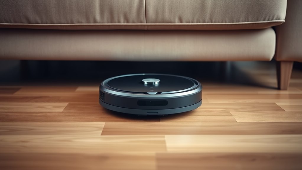 Since maneuvering tight spaces under couches requires precision, the type of navigation technology a robot vacuum uses becomes a key factor. Laser-based navigation, like LIDAR, offers the most accurate mapping and obstacle avoidance, making it ideal for complex layouts and tight spots. Infrared sensors help detect obstacles and prevent falls, essential for safe cleaning under furniture. Camera-based navigation provides real-time visual mapping, allowing the vacuum to recognize and adapt to dynamic environments and low-clearance areas. Less precise systems, like random navigation, often miss spots or get stuck, especially in tight spaces. Advanced models include sensors that detect height restrictions, ensuring they avoid low-clearance zones without damaging furniture or getting lodged. Selecting the right navigation tech guarantees thorough, efficient cleaning under your couch.