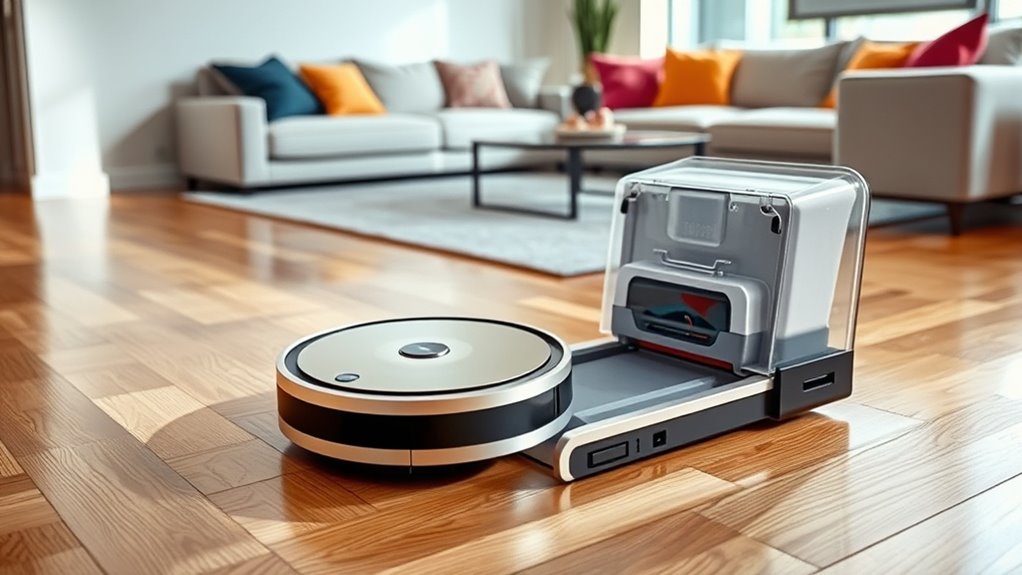 If you’re looking for robot vacuums with large 4-liter dust bags that make cleaning effortless, I’ve found some top options. Models like the Lefant M210, Eureka E20 Plus, and Dreame D10s Plus offer strong suction, smart navigation, and easy maintenance with sealed, large-capacity bags. These vacuums can handle extended cleaning sessions without frequent emptying. Keep going to discover detailed features and which might be best for your home.