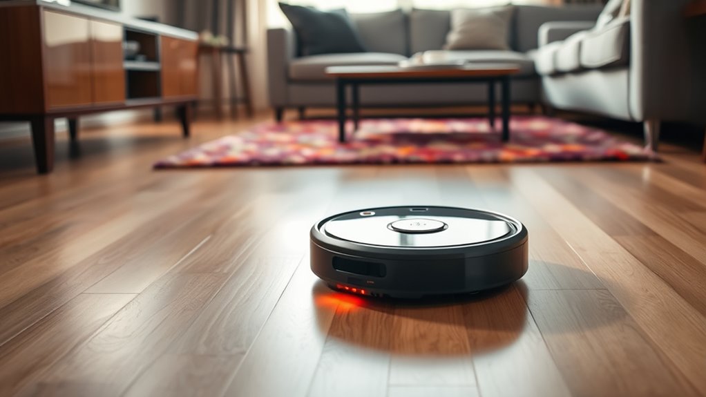 Imagine a tiny robot scanning your floor like a detective searching for clues. Its sensors analyze dirt levels in real-time, instantly recognizing the dirtiest spots. These sensors then send signals to focus cleaning power there, much like shining a spotlight on trouble areas. This smart prioritization guarantees your floors get thoroughly cleaned, leaving no patch unattended. I love how this technology makes cleaning more efficient and keeps my home spotless.