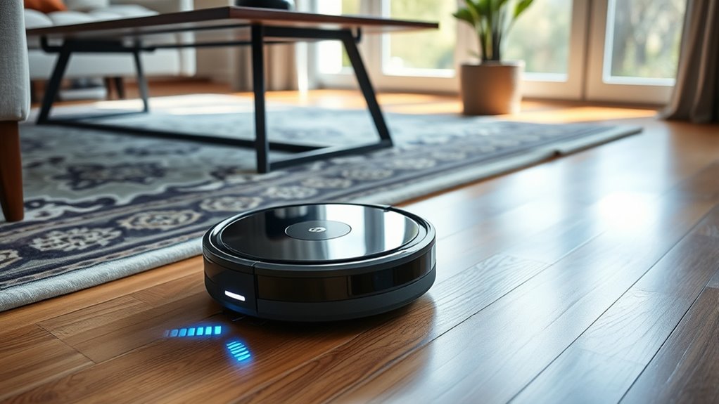 Think of your robot vacuum’s edge detection sensors as the vigilant eyes guiding it safely around your home. To keep them sharp, I regularly wipe the sensors with a soft, damp cloth to remove dust and grime. I also avoid exposing the sensors to direct sunlight or moisture. Occasionally, I check for firmware updates to guarantee the sensors are operating with the latest intelligence, ensuring my bot navigates flawlessly.