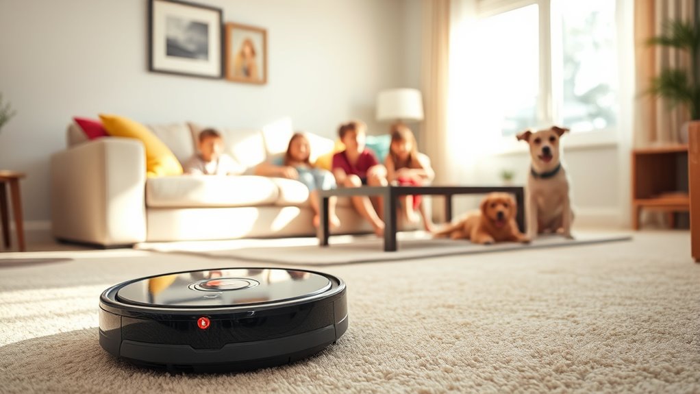 Think of family mode as a loyal guardian, tailored to protect your home’s health. It often includes allergy and pet hair cleaning features, much like a vigilant watchdog sniffing out trouble. These settings prioritize removing allergens and pet dander, ensuring a cleaner, happier space. While not every model offers all features, many are equipped to handle pet hair and allergens, making your home safer for everyone.
