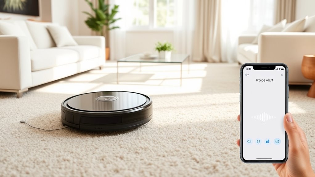 Since customizable voice alerts can markedly enhance the user experience, I pay close attention to the options available when selecting a robot vacuum. Many models let me tailor alerts for specific cleaning statuses, like completion, errors, or obstacles, which keeps me better informed. Some vacuums allow me to enable or disable certain notifications through app settings, giving me control over what I hear. I also appreciate the ability to choose different voice prompts or languages to match my household’s preferences. Setting up alerts for low battery, full dustbin, or maintenance reminders helps me stay on top of device upkeep. Advanced models even integrate with smart home assistants, letting me program personalized notifications for various cleaning events, making the entire process smarter and more convenient.