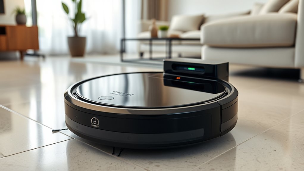 Effective navigation and obstacle handling are vital for ensuring your robot vacuum with smart dirt disposal can clean thoroughly without frequent interruptions. Advanced systems like LiDAR or vSLAM let the robot create precise maps and plan efficient routes while avoiding obstacles. Sensors such as infrared, ultrasonic, or 3D cameras help detect furniture, cords, and household items, allowing seamless maneuvering. Smart obstacle detection includes features like auto-detection of pet toys or clutter, with some models rerouting or pausing to prevent entanglement or damage. This reduces the chances of getting stuck, ensuring continuous cleaning. Multi-sensor data integration allows the vacuum to adapt to changing environments, navigate narrow spaces, and prevent falls from stairs or ledges, making your cleaning routine more reliable and effortless.