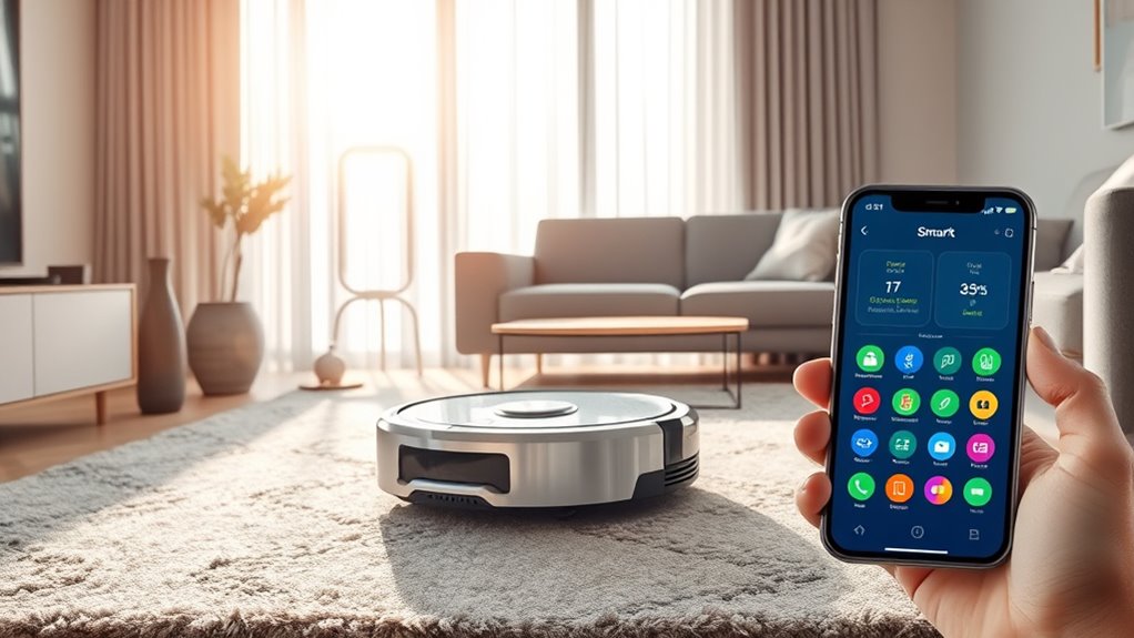 When choosing a robot vacuum with smartphone notifications, it’s important to contemplate the variety of alerts the device can send. Some models provide real-time updates on task completion, obstacle detection, and low battery warnings, keeping you informed at all times. Many also send maintenance prompts, such as alerts for a full dustbin or worn mop pads, which help maintain peak performance. Others offer customizable notifications for specific zones or restricted areas, giving you greater control over cleaning routines. Most devices send push notifications through smartphone apps, so you stay updated even when you’re away from home. The range of notification types varies by model—from simple status updates to detailed reports on cleaning progress and issues—allowing you to choose a device that best fits your monitoring preferences.