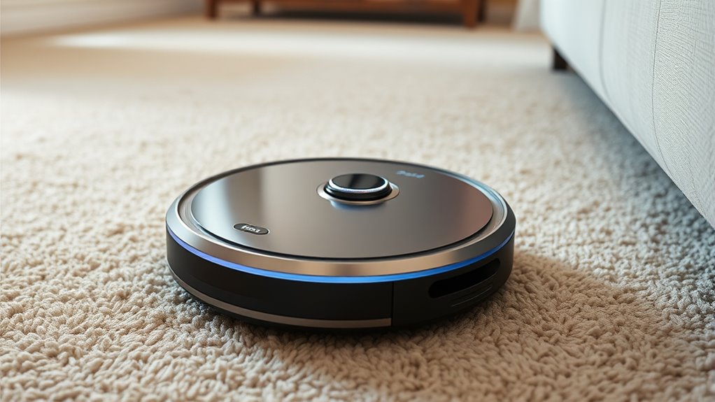 Choosing a robot vacuum with effective obstacle detection technology is essential for seamless navigation, especially when using turbo mode. Advanced sensors like infrared, 3D structured light, or LiDAR help the vacuum identify furniture, walls, and objects in real-time, preventing collisions. Some models go further by using AI-powered object recognition to distinguish household items such as shoes, cords, or pets, reducing accidental bumps. Sensors that detect changes in surface height or obstacles up to 15mm prevent falls and getting stuck. Many systems combine multiple sensors to create accurate maps of your space, ensuring thorough cleaning. Good obstacle detection minimizes damage, improves coverage, and reduces the need for user intervention, making turbo mode cleaning more efficient and hassle-free.